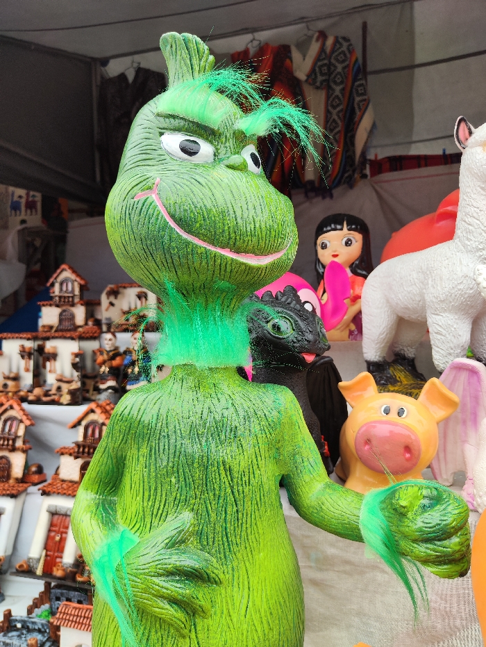 A green, textured Grinch statue with neon green hair stands on a table. Behind it are various figurines including a black dragon, a pig, a white llama, and a doll. Miniature houses are visible to the left of the Grinch. Clothing hangs in the background of the shot. The scene appears to be a market or a craft fair.