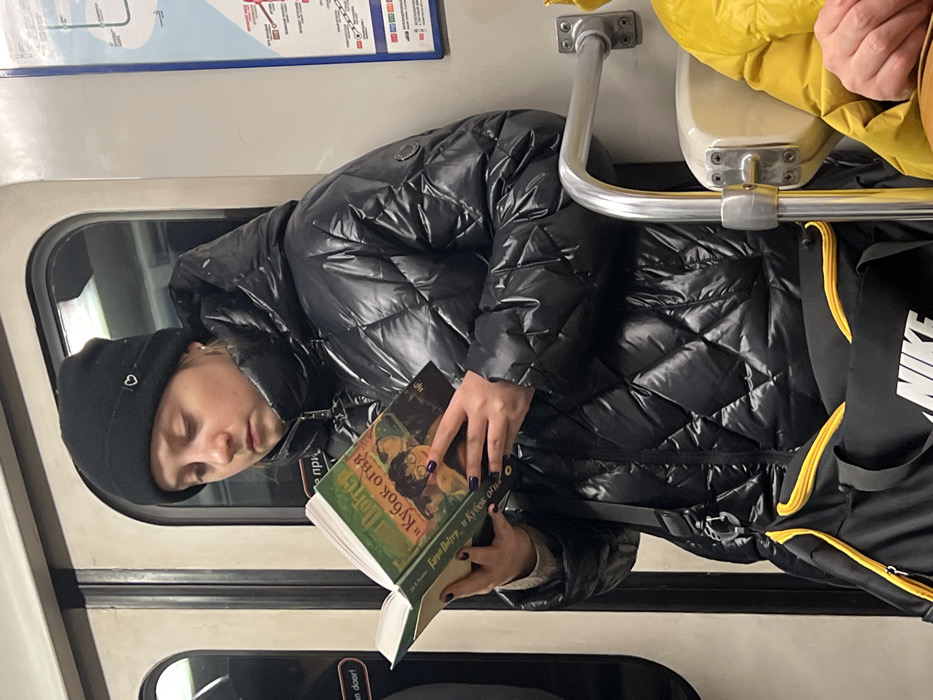 - "In a subway car, a person wearing a black beanie and puffy black jacket appears to be asleep while holding a Russian edition of "Harry Potter and the Goblet of Fire" by FM-4Mf512, licensed under CC BY 4.0
