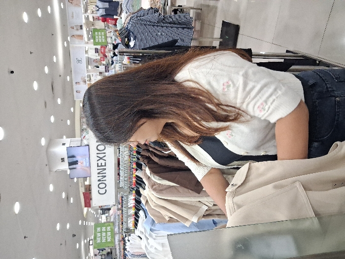 A woman with long brown hair is browsing through a clothing rack in a store. She is wearing a white cardigan with small pink flowers and dark jeans. The clothing rack is full of various shirts and blouses, predominantly in light colors like beige and blue. A sign reading "CONNEXION" is visible above the racks, and multiple "NEW IN" signs are displayed. The store appears well-lit with many ceiling lights.