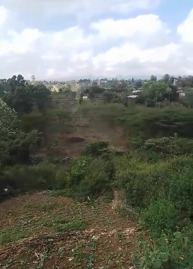 landscape view with varying levels of greenery. The foreground consists of a rough terrain with vegetation, some dry leaves, and a discarded plastic bag. Moving towards the center, there's a dirt path or clearing that leads into a dense area filled with shrubs and trees. The background reveals a settlement with houses and more trees, under a sky filled with white clouds and patches of blue sky.