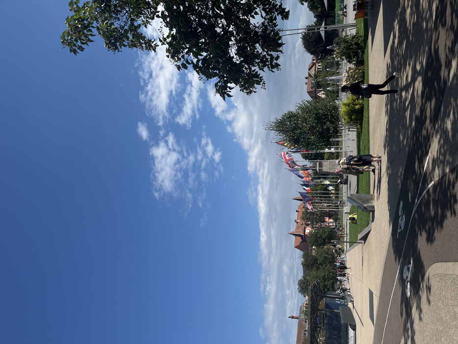 The image captures an outdoor public square, identified as Place Rapp in Colmar, France, under a bright blue sky with dispersed white cumulus clouds. Direct sunlight illuminates the scene, casting visible shadows on the ground. In the mid-ground, a line of numerous international flags, including the French, United Kingdom, and European Union flags, are prominently displayed on tall poles. These flags encircle a large, dark stone monument, the Monument à l'Amiral Bruat, positioned centrally. To the right of the flags, an active water fountain with multiple jets is situated within a landscaped area. The background features several buildings with reddish-brown tiled roofs and multiple gables, characteristic of Alsatian architecture. On the far left, a modern structure with a metal frame is partially visible. The foreground consists of a paved pathway with a distinct curved line and white bicycle lane markings. Shadows from an unseen tree dominate the right side of this pathway. Several individuals populate the square. A person in dark clothing walks from left to right across the paved area in the mid-ground right. To their left, two individuals are standing near a low, dark stone structure, appearing to be engaged in conversation. Further to the left, a single person is seen reclining on a patch of green grass. Additional pedestrians are visible in the background on the left, near the modern structure, and further away. On the far right, orange chairs and tables are arranged, suggesting an outdoor seating area.