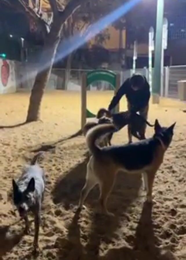 At night, inside a dog park with sand on the ground, a person wearing a black jacket and pants is petting several dogs of different breeds. There are at least four dogs, including a German Shepherd mix, a blue heeler, and some dark-colored dogs. The park is lit by streetlights and there are fences, trees, and some playground equipment visible in the background. The person interacts with the dogs, petting them and moving their hands around them. The dogs stand or walk around, some sniffing the ground.