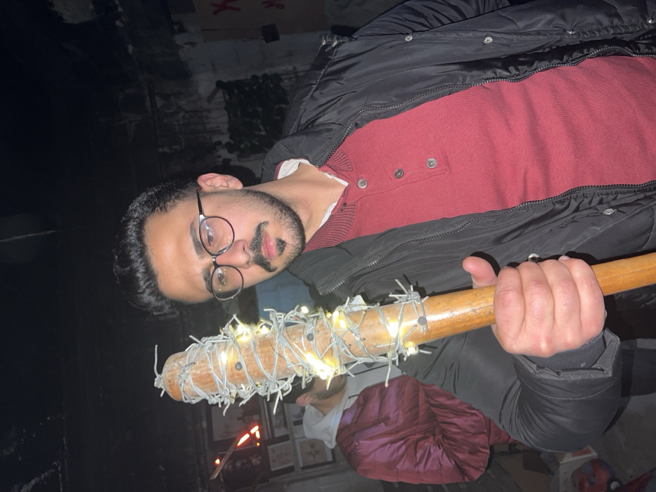 - "A man with glasses and a mustache holds a baseball bat wrapped in barbed wire and fairy lights" by FM-NiDCC3, licensed under CC BY 4.0