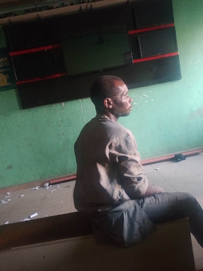A man sits on a ledge, his gaze directed to the right. He is wearing a patterned shirt and dark pants. Behind him is a green wall, adorned with a black and red TV cabinet setup. The room appears cluttered, with scattered paper debris on the floor. The lighting is somewhat dim, casting shadows across the scene.