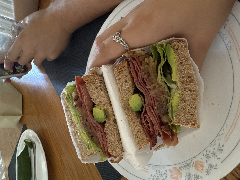 The image depicts an indoor scene centered on a sandwich. A large sandwich, cut in half and partially wrapped in white paper, rests on a round white ceramic plate with a floral pattern featuring faded orange-pink flowers and grey-blue leaves. The sandwich is constructed with whole wheat bread, multiple layers of thinly sliced reddish-brown deli meat, green lettuce leaves, and several pieces of light green avocado. Smaller reddish-brown elements, possibly relish or pickled vegetables, are also visible within the filling. A light-skinned hand, presumably female, with a silver-colored crown or chevron-shaped ring adorned with small stones on the ring finger, holds the plate in the foreground. In the background, on a polished wooden table surface, two additional hands are present. One hand holds a clear glass containing water, while the other holds a dark-colored smartphone. A dark placemat is visible under these hands. To the upper left, another white ceramic plate contains a sliced cucumber and a metal fork. A light beige rectangular object, possibly a paper bag or carton, is situated in the far background. The lighting suggests an ambient indoor setting. No visual identifiers within the image provide information to confirm a specific location in Rishon LeZion, Israel.