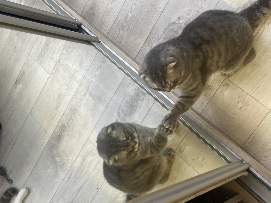 - "A gray striped cat stands on light wood-grain flooring, its paw touching its reflection in a sliding mirror" by FM-A5lOj2, licensed under CC BY 4.0