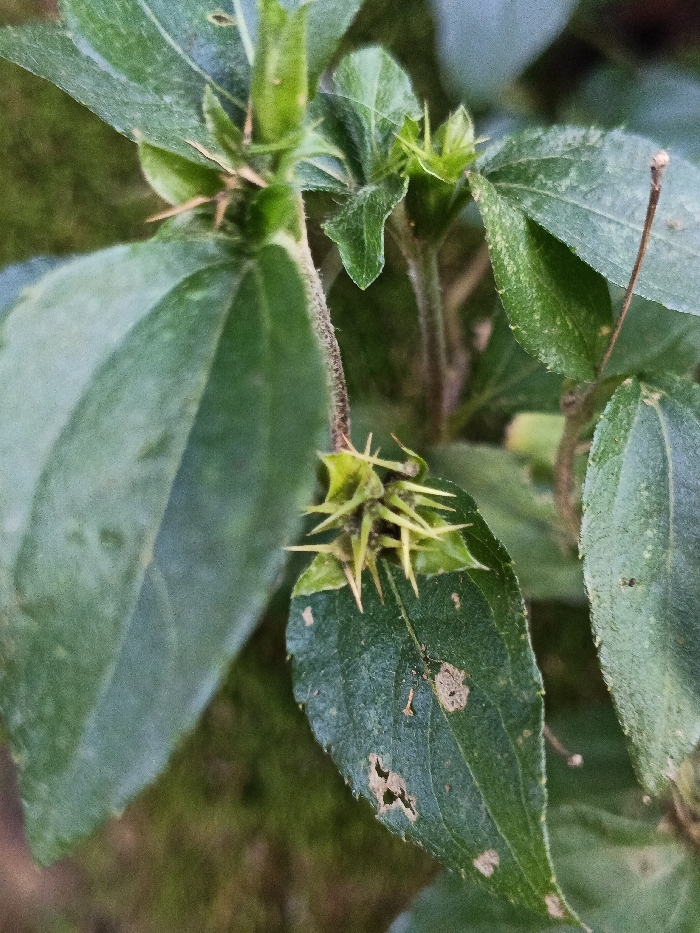 The image depicts a close-up view of a green plant, observed in a natural outdoor environment within the city of Tobanda, Sierra Leone. The primary subject is a plant stem adorned with multiple green leaves and two distinct clusters of spiky structures. The leaves are predominantly dark to medium green, exhibiting an ovate to lanceolate shape with visible venation. Several leaves show minor damage, including small irregular holes and light brown discoloration spots on their surfaces. A faint dusty or textured appearance is present on some leaf surfaces. A central stem, appearing reddish-brown and textured, possibly hirsute, extends vertically through the frame. From this stem, leaves and the spiky structures emerge. The most prominent feature is a cluster of sharp, yellowish-green, conical spines located centrally on a stem above a leaf. This cluster measures approximately 3 cm in diameter and consists of numerous needle-like projections radiating outwards from a central, darker green core. The tips of these spines are lighter yellow-green, transitioning to darker green at their base. A second, smaller, and less defined spiky cluster is visible higher up on the same stem, further back in the frame. The background consists of blurred green and brownish hues, consistent with out-of-focus foliage and vegetation, indicating a natural setting. Natural light illuminates the scene, creating soft shadows and highlighting the plant's textures. No human figures, animals, or specific man-made objects are present or discernible within the frame. No actions or interactions are depicted.