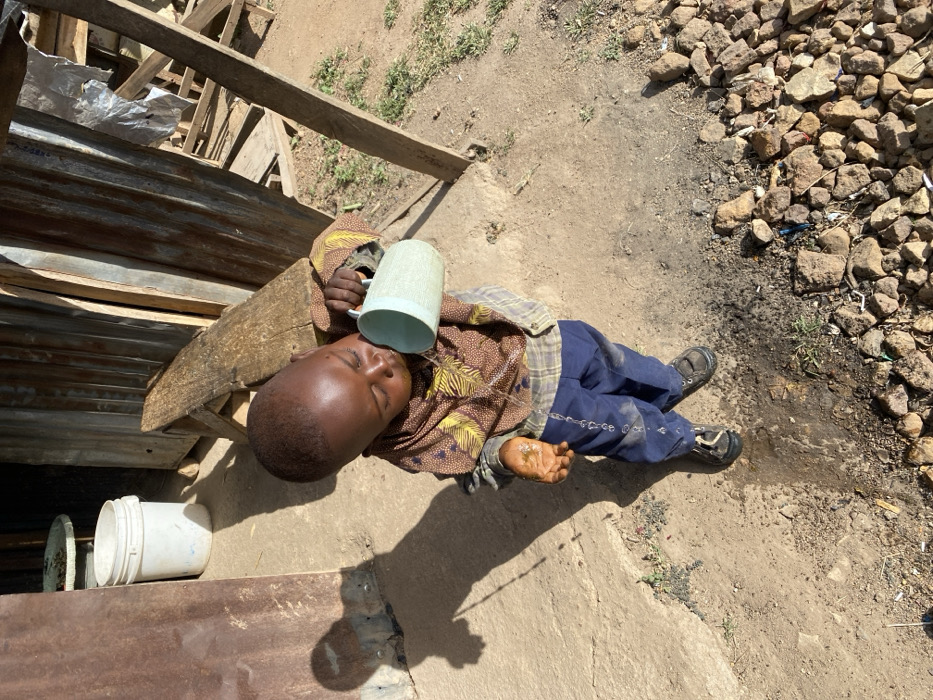 A young child is depicted outdoors in Jos, Nigeria, in direct sunlight