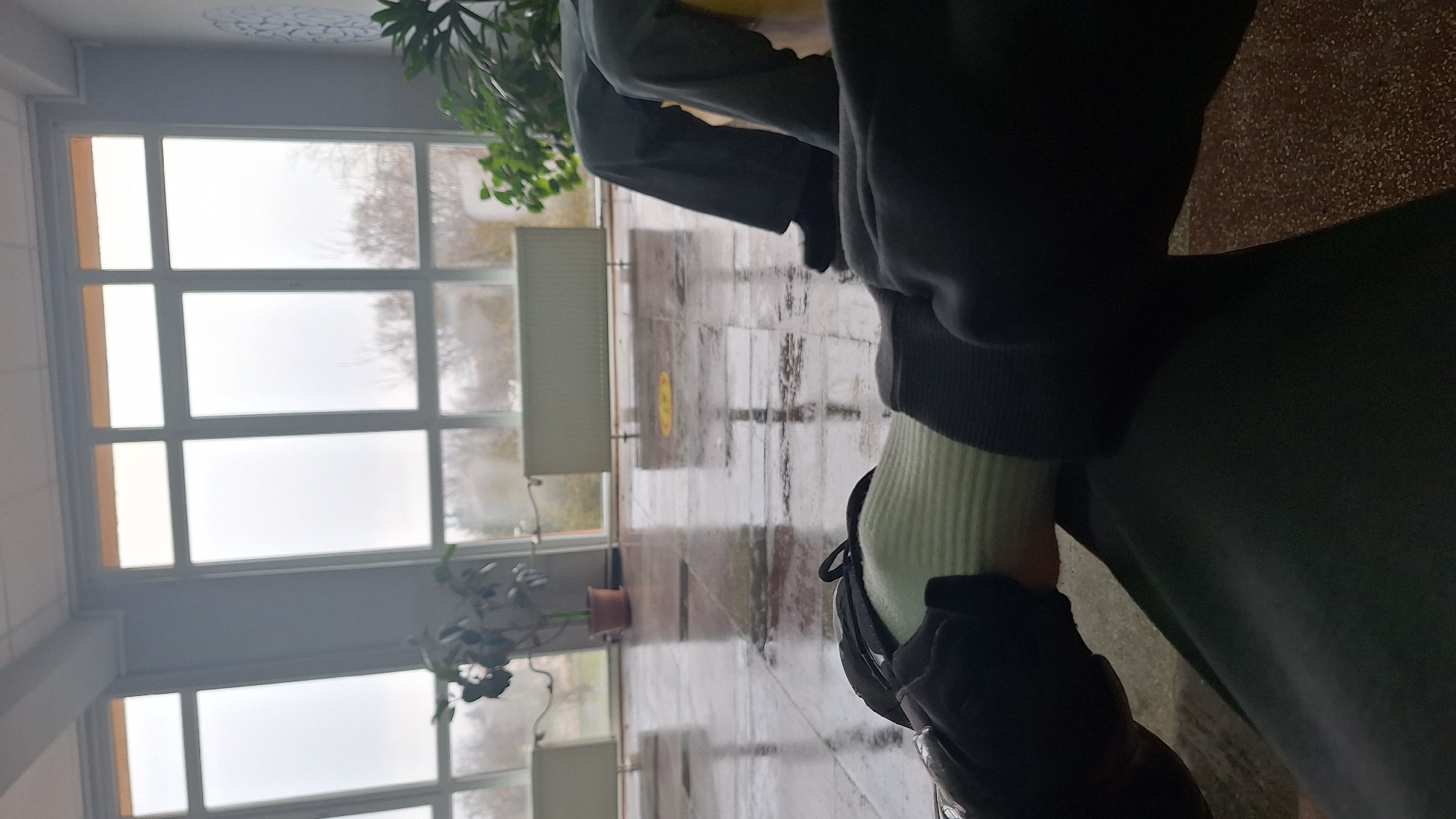 This image depicts an interior scene within a building located in Knezha, Bulgaria. The foreground shows the observer's legs, clad in dark trousers, light green ribbed crew socks, and a black athletic-style shoe on the left foot. A dark garment sleeve rests on the right knee. To the right, the lower legs and feet of a second seated individual are partially visible, wearing dark trousers and dark shoes. The floor is composed of large, polished, dark-toned tiles, highly reflective of the windows and overhead light. A yellow circular floor marker with red text or graphics is visible on the floor in the midground. Along the wall, two white panel radiators are positioned beneath a continuous series of large, multi-pane windows. Through these windows, an outdoor scene featuring an overcast sky and deciduous trees is visible. Two potted plants are situated within the room: a smaller, dark-leafed plant in a brown pot near the left window, and a larger, bushy green plant on the far right. A section of a light blue abstract mural or pattern is visible on the far right wall. The ceiling consists of white acoustic panels.