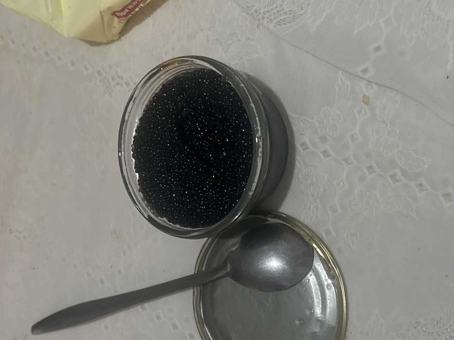 The scene, located in Karmiel, Israel, depicts an indoor tabletop setting. A clear, round glass jar is positioned centrally, containing small, spherical, black granules consistent with caviar, filled to the brim. To the left, an inverted silver-colored metal lid supports a silver-colored metal spoon, its concave side facing upwards. A partially visible yellow wrapper with red text is situated in the upper right background. The items rest on a white tablecloth adorned with an embossed floral and geometric pattern. No individuals or active interactions are observed.