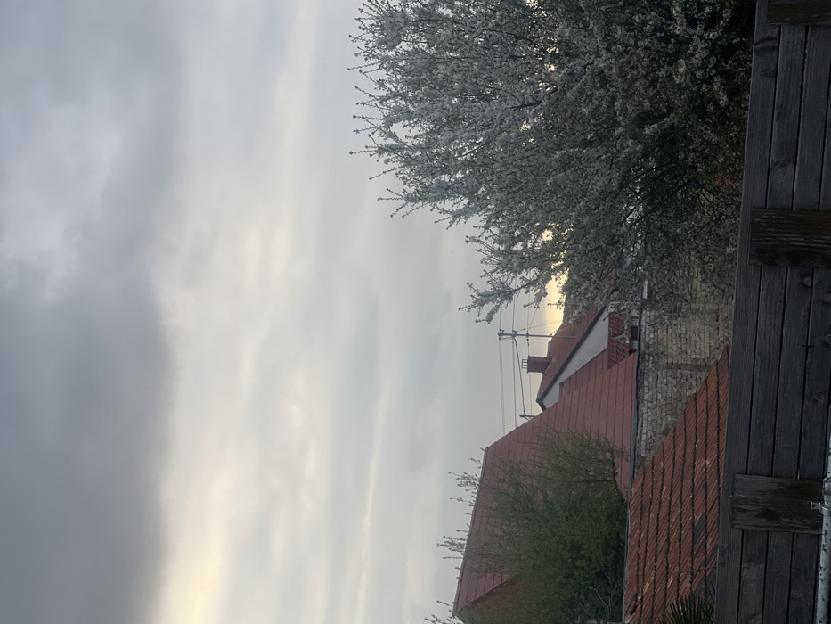 This image displays an exterior view of a residential area located in Ludwigshafen am Rhein, Germany. The sky occupies the upper two-thirds of the frame, characterized by dense grey clouds with a lighter, diffuse yellowish-white glow along the horizon. In the immediate foreground, a dark grey, weathered wooden fence composed of horizontal planks extends across the bottom. Beyond the fence, several buildings with distinct red terracotta-tiled pitched roofs are visible. On the left, a portion of a roof is partially obscured by the fence line. Further back, a larger building features a steep red-tiled roof partially enveloped by green foliage. A light-colored brick wall or facade horizontally dissects the midground. Above the buildings, utility poles with overhead power lines are discernible against the sky. To the right, a large deciduous tree in full bloom is prominently featured, densely covered with numerous small white blossoms. No individuals or specific actions are depicted within the frame.