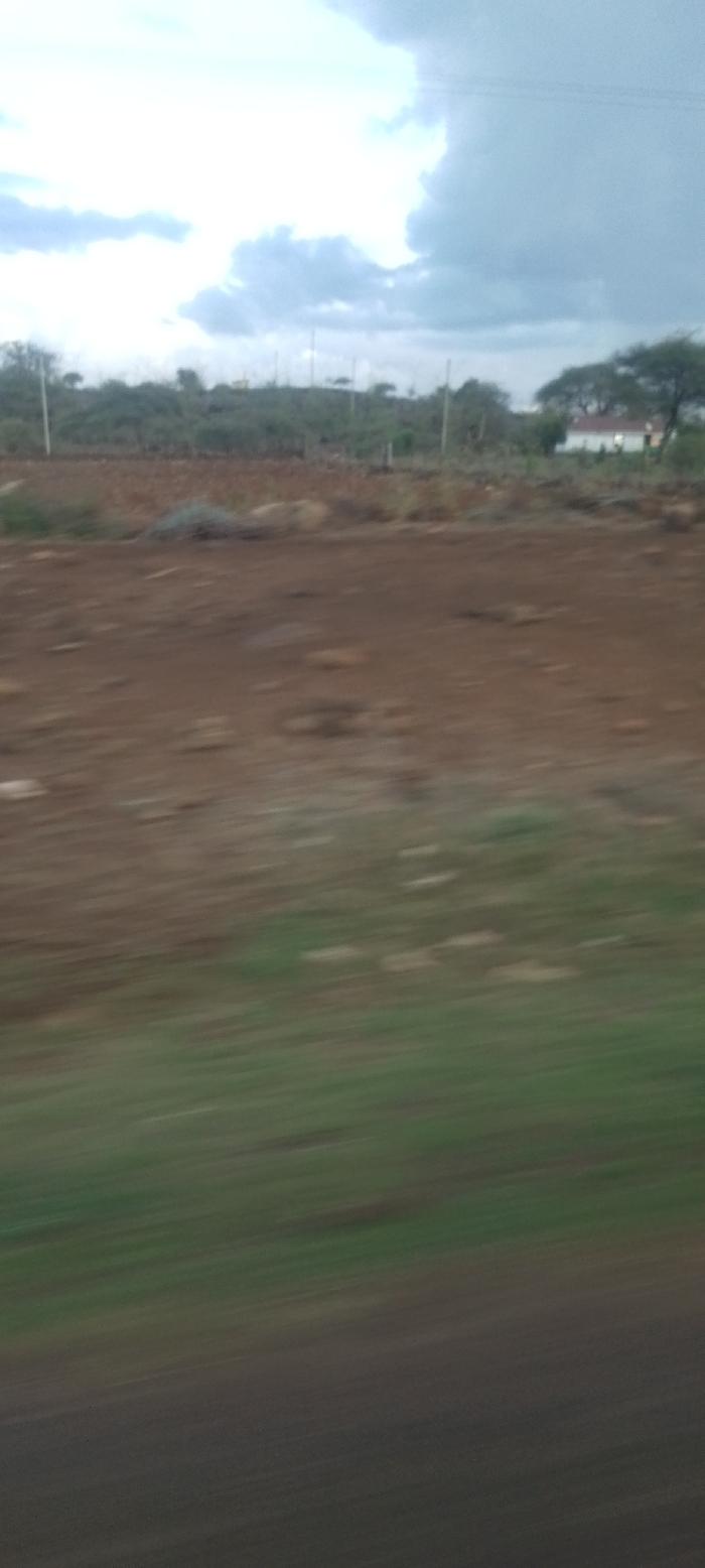 This image captures a blurry outdoor scene, indicative of motion capture, under an overcast sky. The foreground exhibits a horizontal band of blurred green vegetation, transitioning into a wider area of blurred reddish-brown soil with visible texture. In the mid-ground, a section of reddish-brown earth contains a pile of grey, granular material, likely gravel. Further back, a dense line of dark green, low-lying trees or shrubs extends horizontally, interspersed with several slender, light-colored vertical poles. In the distant background on the right, a white single-story building with a reddish roof is partially visible amongst trees. The upper third of the image is occupied by an overcast sky featuring a mix of bright white and grey clouds. No individuals are present in the scene. The location is undetermined, within the city of Unknown, Unknown.