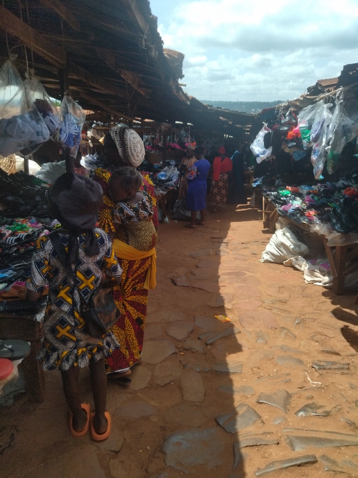 bustling market in Lokoja, Nigeria. The coordinates (latitude: 7.404, longitude: 7.632) place the market on a dirt road, beneath a makeshift canopy of wooden beams and corrugated tin. The market is filled with vendors selling a variety of goods, including clothing, shoes, and bags. There are several people walking through the market, including two women, one carrying a small child on her back. The women are wearing brightly colored clothing. The market is located in a densely populated urban area. The surface of the road is made up of flat, irregular stones. The stalls and the surrounding environment are shaded by the bright sunshine. The market is a vibrant place full of activity, with a strong sense of community.