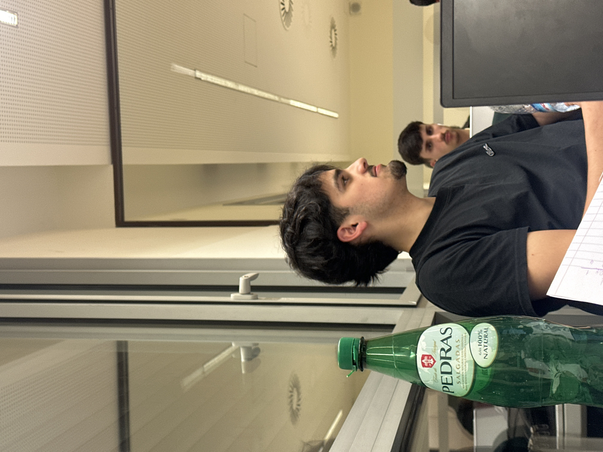 The image depicts an indoor scene within the city of Guimarães, Portugal, appearing to be a classroom or office environment. In the foreground on the left, a green plastic bottle of "PEDRAS SALGADAS" carbonated mineral water, labeled "GÁS 100% NATURAL," stands upright with its green cap visible. The bottle partially obscures a window structure to its left. A young adult male with dark, wavy hair, a short beard, and a goatee is seated in the mid-ground, facing right in profile. He is wearing a black short-sleeved t-shirt with a small white crocodile logo on the left chest. His right arm rests on a surface, beside which a sheet of white lined paper is visible. Further back and to the right, a second young adult male with short dark hair and a mustache is partially visible, looking forward. He appears to have white earbuds in his ears. A black laptop screen stands in front of him, partially obscuring his body. The background features light-colored walls and a white acoustical tile ceiling with a perforated pattern. The ceiling includes multiple long, rectangular fluorescent light fixtures and circular air vents. A large window with white framing is prominent on the left, exhibiting reflections of the interior ceiling and light sources. The lighting is artificial and consistent with an indoor institutional setting.