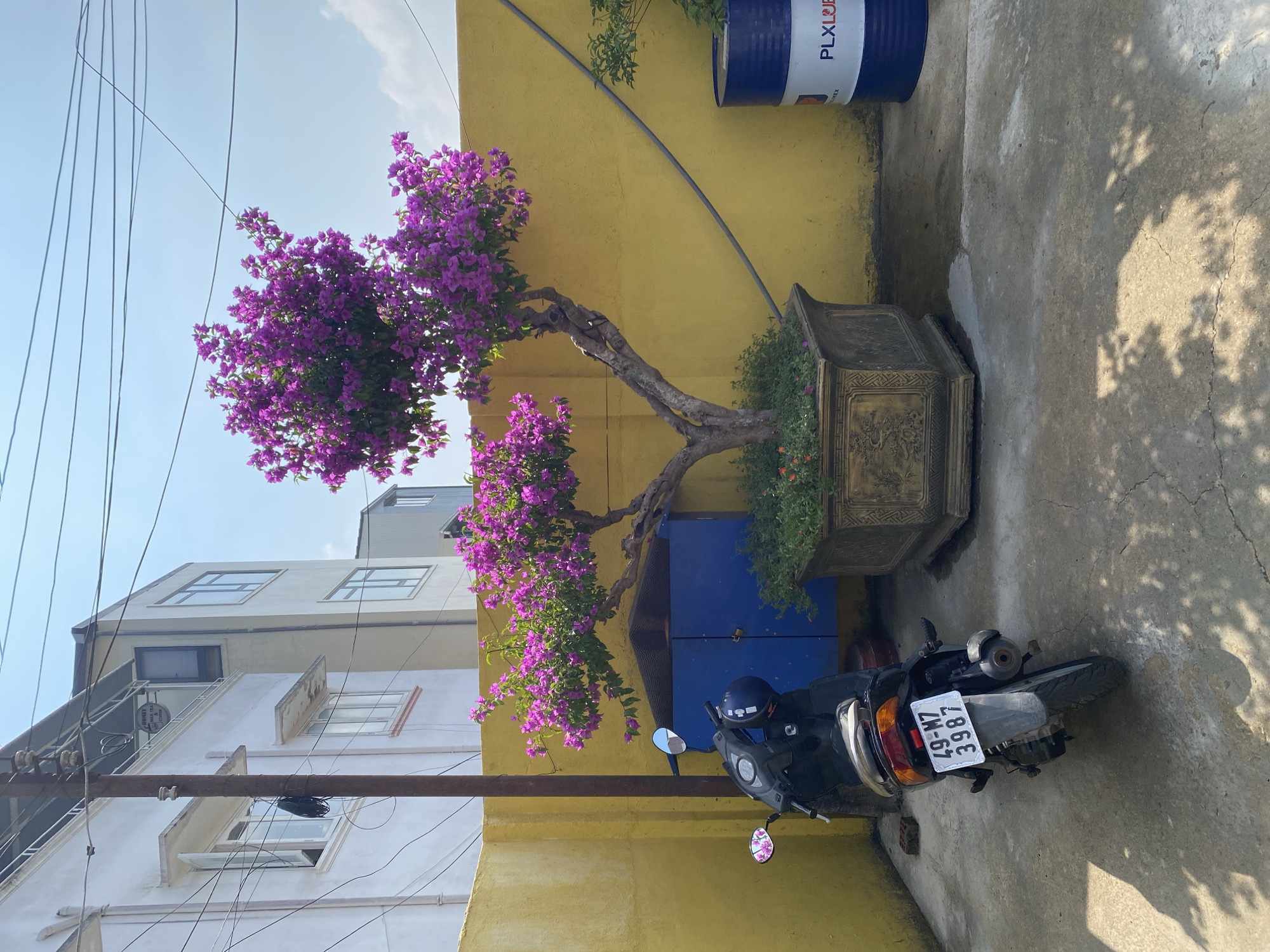 street scene in Lam Vien - Da Lat, Vietnam. A potted bougainvillea tree with vibrant purple flowers stands against a yellow wall. A parked black motorcycle is positioned next to the planter. A blue barrel is visible on the wall above the planter. A building with multiple windows is on the left side of the frame. Overhead power lines traverse the top left portion of the image. The motorcycle's license plate number is 49-M7 3987.