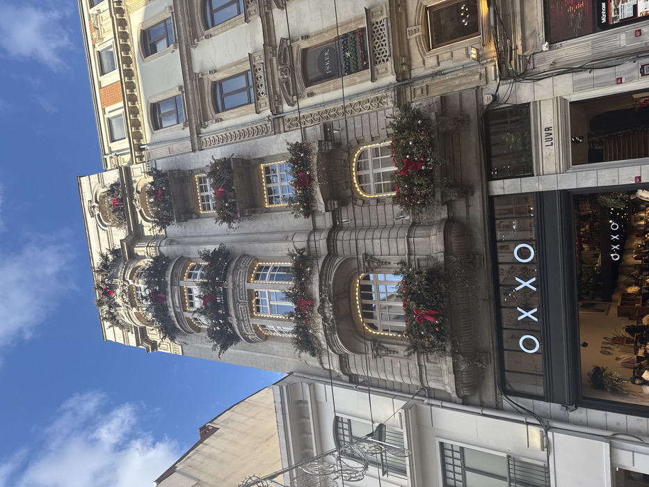 An ornate, multi-story stone building, located on İstiklal Caddesi in Beyoğlu, Istanbul, Turkey, is prominently featured. The building's facade, characterized by classical architectural elements, multiple windows, and projecting curved balconies, is extensively decorated with evergreen garlands, numerous red bows, and white string lights, indicating a festive period. The ground floor of this building houses an "OXXO" retail store, identified by a large, illuminated white sign above its entrance. Vague figures, likely customers or staff, are visible inside the store. Adjacent to the OXXO entrance, a smaller doorway is marked with the word "LUVR" above it. To the left, a plainer, white-painted building with rectangular windows is partially visible. To the right, another ornate building with decorative stonework and partial signage, including "JNKIR" on an upper balcony and "MÜNHA..." at street level, extends upwards. The scene is captured under a clear blue sky with scattered white clouds.