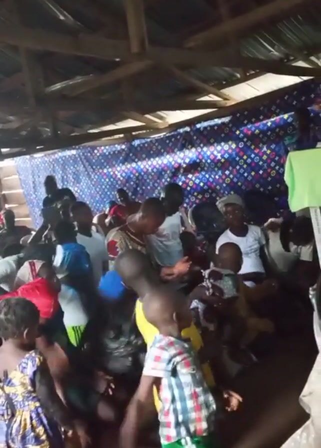 group of adults and children gathered inside a structure. The structure has a tin roof supported by wooden beams. A blue patterned fabric is used as a backdrop. A man in a white robe is standing and holding up a light green t-shirt with a design on it. A drum is positioned to the right of the frame. The children are wearing various colorful clothes.