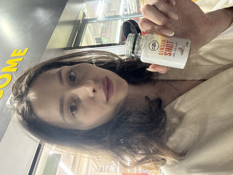 A woman holds a "Cipri Ginger Shot" bottle. The bottle's label is partially in Arabic. She has long brown hair and is wearing a light-colored outfit. She is indoors with a "WELCOME" sign visible in the background. The photo is rotated, so the subject appears sideways. The setting could be a grocery store or market.