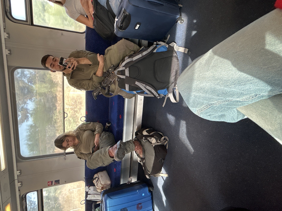 The image depicts the interior of an Israel Railways passenger train, observed from the perspective of a seated individual. Bright sunlight streams through the windows, casting shadows on the floor. The train is likely near or passing through Hadera-West Railway Station in Hadera, Israel. Three individuals are visible in the mid-ground, seated on blue fabric bench seats. 1. On the left, a light-skinned female individual with blonde hair, dressed in an olive-green military-style uniform (long-sleeve shirt and cargo pants), sits with her left leg bent and her right foot, clad in a brown boot, resting on a black duffel bag on the floor. She holds a smartphone in both hands and appears focused on its screen. Adjacent to her on the seat is a white handbag with a brown pattern. A blue rolling suitcase is positioned on the floor to her left. 2. In the center, a light-skinned male individual with short dark hair and a beard, also dressed in an olive-green military-style uniform, sits leaning slightly forward. He holds a smartphone in his right hand and views its screen. Resting against his left leg and a blue and black backpack on the floor is an assault rifle, appearing to be an M4 variant, equipped with optics and a forward grip. 3. On the far right, a light-skinned female individual with blonde hair is partially visible, wearing a light-colored t-shirt. She is also engaged with a smartphone. A dark blue rolling suitcase rests on the floor to her left. The floor is covered with a dark blue carpet. The windows reveal an outdoor landscape with sparse trees and vegetation under a clear sky. The overall scene suggests military personnel commuting by train.