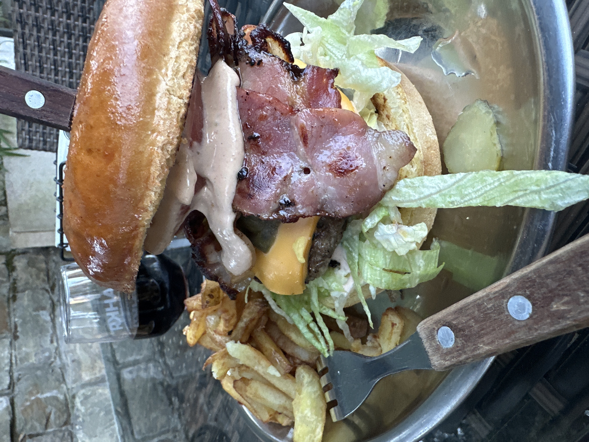 A close-up, high-angle shot shows a burger and fries served on a metal tray, outdoors, likely in Bankya, Bulgaria