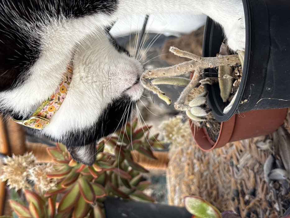 A black and white domestic cat, distinguished by white facial fur, prominent white whiskers, and a floral-patterned collar with a gold buckle, is captured in an outdoor setting within the city of Yaiza, Spain. The cat's head is lowered, its nose making direct contact with a small, fuzzy succulent plant exhibiting a dry, branched stem, situated in a black plastic pot on the right. A portion of the cat's white front paw is visible near the plant within this pot. To the mid-ground left, a terracotta-colored plastic pot contains an obscured plant. In the background, a larger succulent with green and red-edged leaves is visible in a dark pot, surrounded by other potted plants and a ground covered in dried organic material, possibly mulch or leaves.