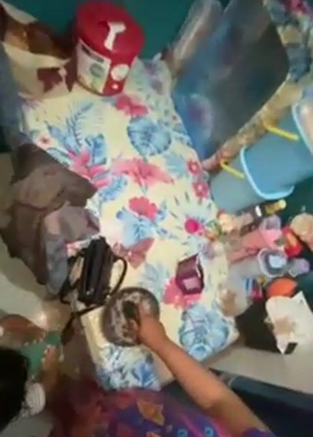 From a high angle, a person is grinding something on a plate using a tool. The person is standing near a bed covered with a floral patterned sheet. There are various items scattered on the bed, including containers, a small bucket, and other miscellaneous objects. A second person, a small child, is visible at the bottom of the frame. The walls are painted teal.