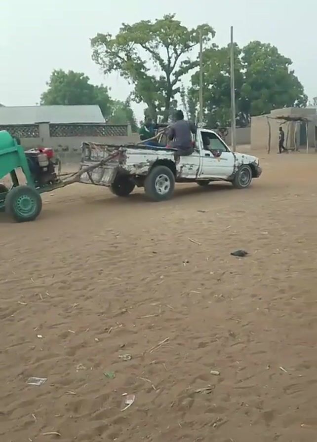 A white pickup truck with two people in the back and one person driving is shown pulling a green machine on a trailer across a dirt field. There are buildings and trees in the background. There are other people standing around in the background. The sky is overcast.