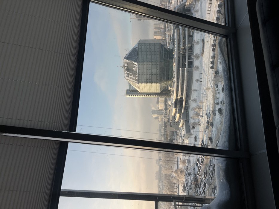 A large, modern building with geometric facets dominates the view through a window