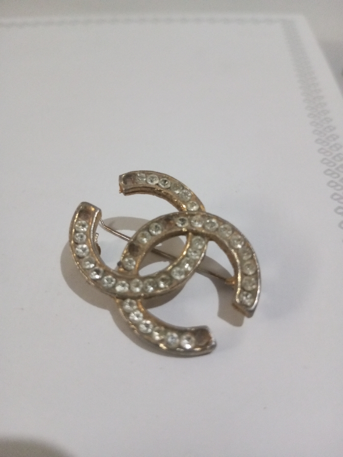 The scene is an overhead, slightly angled close-up of a metallic brooch resting on a plain white surface in Ciherang, Indonesia. The brooch features two interlocking 'C' shapes, creating a double C logo. It is crafted from a light-colored metal, possibly a silver or gold tone, which exhibits visible wear, discoloration, and minor pitting in several areas. Each 'C' is encrusted with multiple small, clear, round faceted stones, consistent with rhinestones or cubic zirconia, approximately 3-4mm in diameter. Some stones appear slightly dull or scratched. A standard pin mechanism, consisting of a straight pin and a C-clasp, is visible on the rear of the brooch. The brooch casts a soft shadow to its lower right. The white surface extends across the frame, with faint, parallel embossed lines or a texture visible on the upper right quadrant, possibly indicating paper or a textured table. No individuals or discernible actions are present within the frame. The environment appears to be an interior setting.