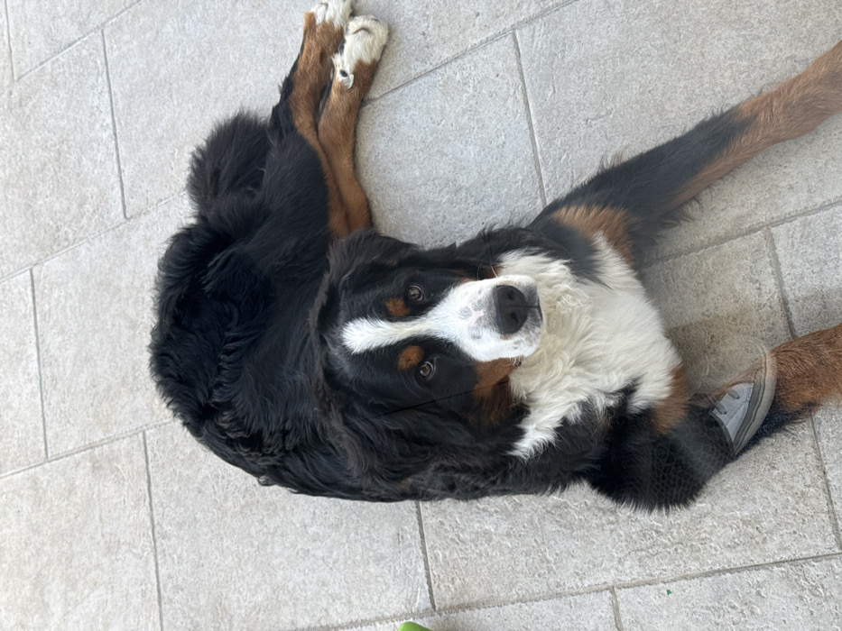 - "A Bernese Mountain Dog lies upside down on a tiled floor" by FM-mkaXg2, licensed under CC BY 4.0