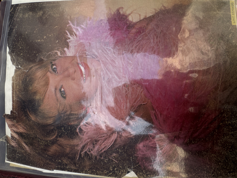 A deteriorated color portrait features French entertainer Line Renaud. The fair-skinned woman, with voluminous blonde hair styled upwards and bangs, smiles directly at the viewer, displaying blue eyes and a wide red-lipped smile. She is adorned with a pink and magenta feathered boa wrapped around her neck and shoulders, over a dark red or magenta garment. The background is an indistinct dark tone, characteristic of a studio setting. The print exhibits extensive damage, including tears along the top and left edges, creases, and widespread surface abrasions and discoloration, with reflective glare indicating it is encased in a protective plastic sleeve. The name "LINE RENAUD" is printed in a yellow rectangle at the bottom right. This image is a studio portrait and does not depict a specific location within the city of Paris, France.