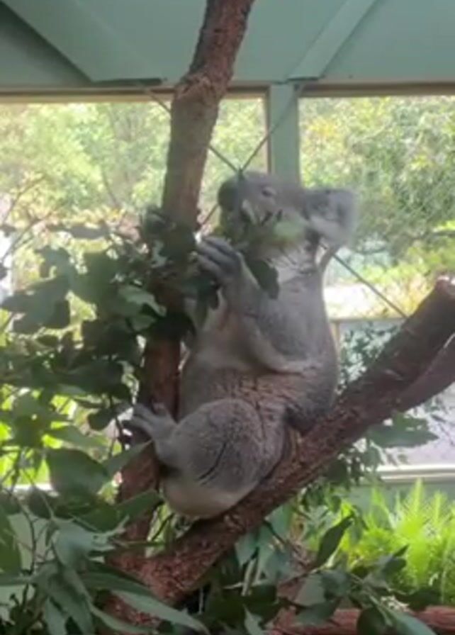 koala sitting in a tree, eating leaves. It is a gray, furry animal with large ears. The tree has green leaves and is inside a building with a green roof and metal siding. Other greenery is visible in the background through the windows. People are talking in the background.