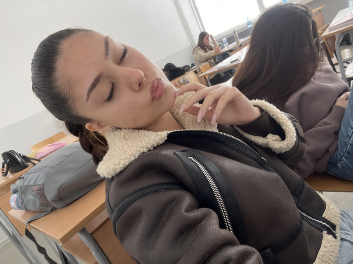 A young female is depicted taking a selfie in a classroom or lecture hall located in Veliko Tarnovo, Bulgaria