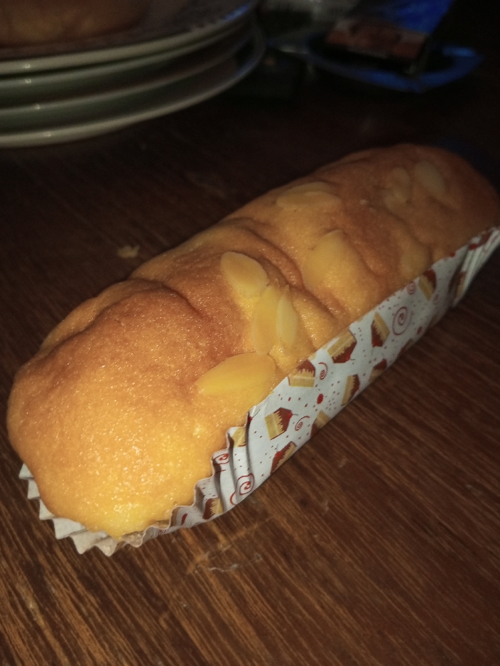 - "A golden-brown, almond-topped loaf cake, enclosed within a white paper liner featuring repetitive cake slice and spiral motifs, rests on a dark wooden surface in Khajuripada, India" by FM-RpQWt1, licensed under CC BY 4.0