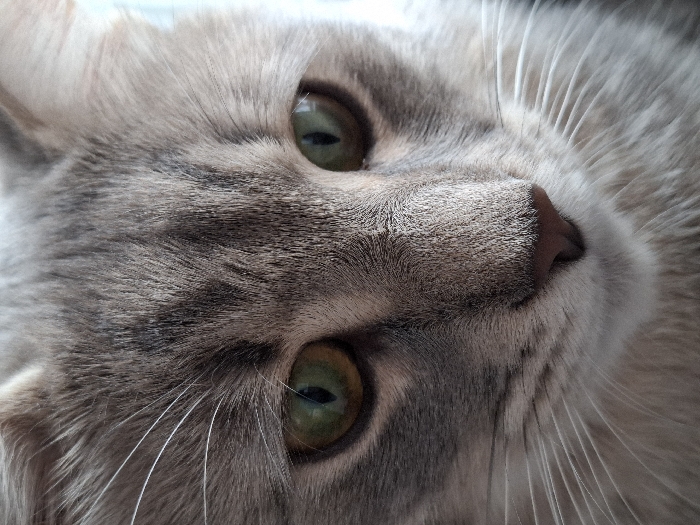 - "A close-up, frontal view depicts the head and upper chest of a domestic cat within the city of Novi Sad, Serbia" by FM-cs6EQ2, licensed under CC BY 4.0