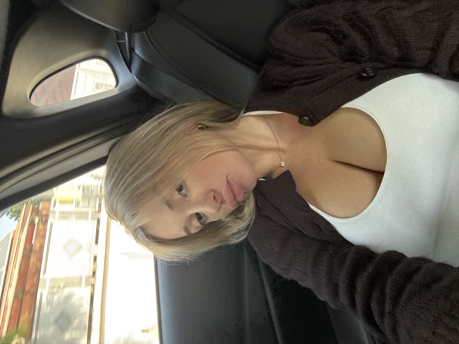 A blonde-haired female is depicted from the upper torso upwards, seated inside the rear of a vehicle, possibly a car