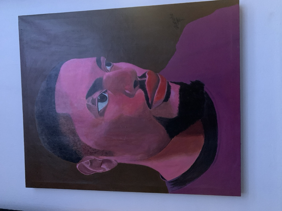 A square painting depicts a man's face turned upwards. His skin is rendered in shades of pink and red, contrasting with a dark brown background on the left and a deep purple area behind his head. He has short, dark hair and a prominent black beard. The lips are painted with shades of red and dark maroon. One eye is partially visible, while the other is fully open with visible reflections. The composition suggests a tilted or unconventional perspective. A signature is discernible in the upper right corner.