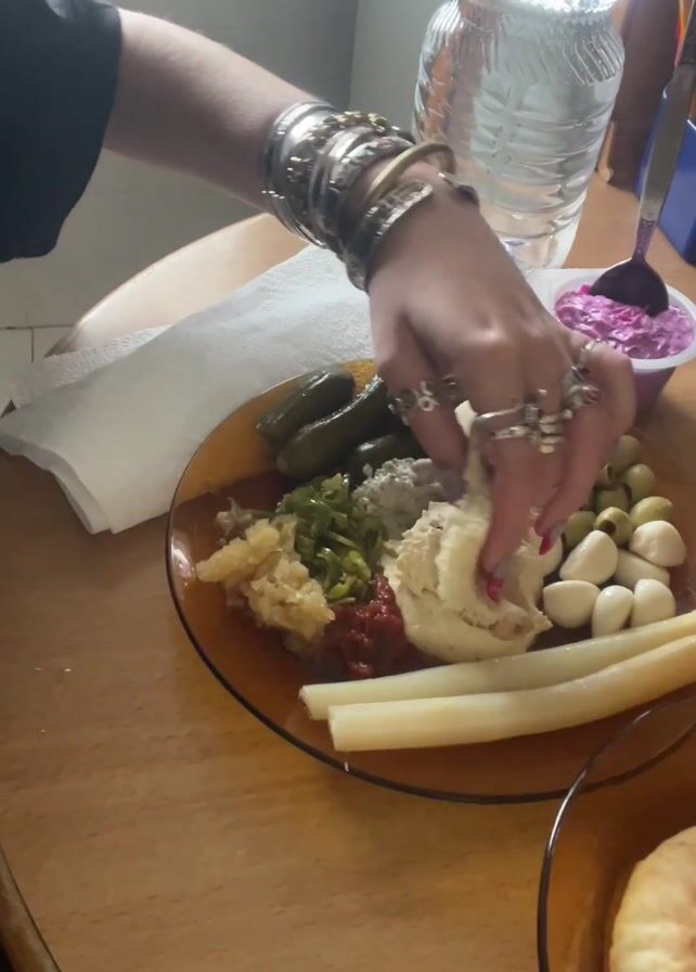 A young woman sits at a wooden table, eating a meal of hummus, pickles, bean sprouts, cheese and pita bread. She is wearing multiple rings on her fingers and several bracelets on her left wrist. She has long, dyed red hair and is wearing a black t-shirt. The table also has a bottle of water, a container of pink dip, a stack of white napkins, and a cell phone. The room has light tile flooring and a window in the background. The woman dips a piece of pita bread into the hummus and eats it.