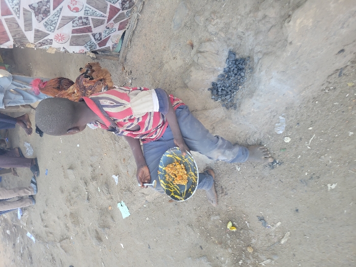 A child sits on the ground next to a small pile of coal, holding a plate of food and a spoon. He wears a red and white striped shirt and gray pants. Chickens are nearby, near a structure with a patterned cloth covering part of it. The ground is sandy and littered with various debris. The overall scene appears to be in a rural or impoverished setting.