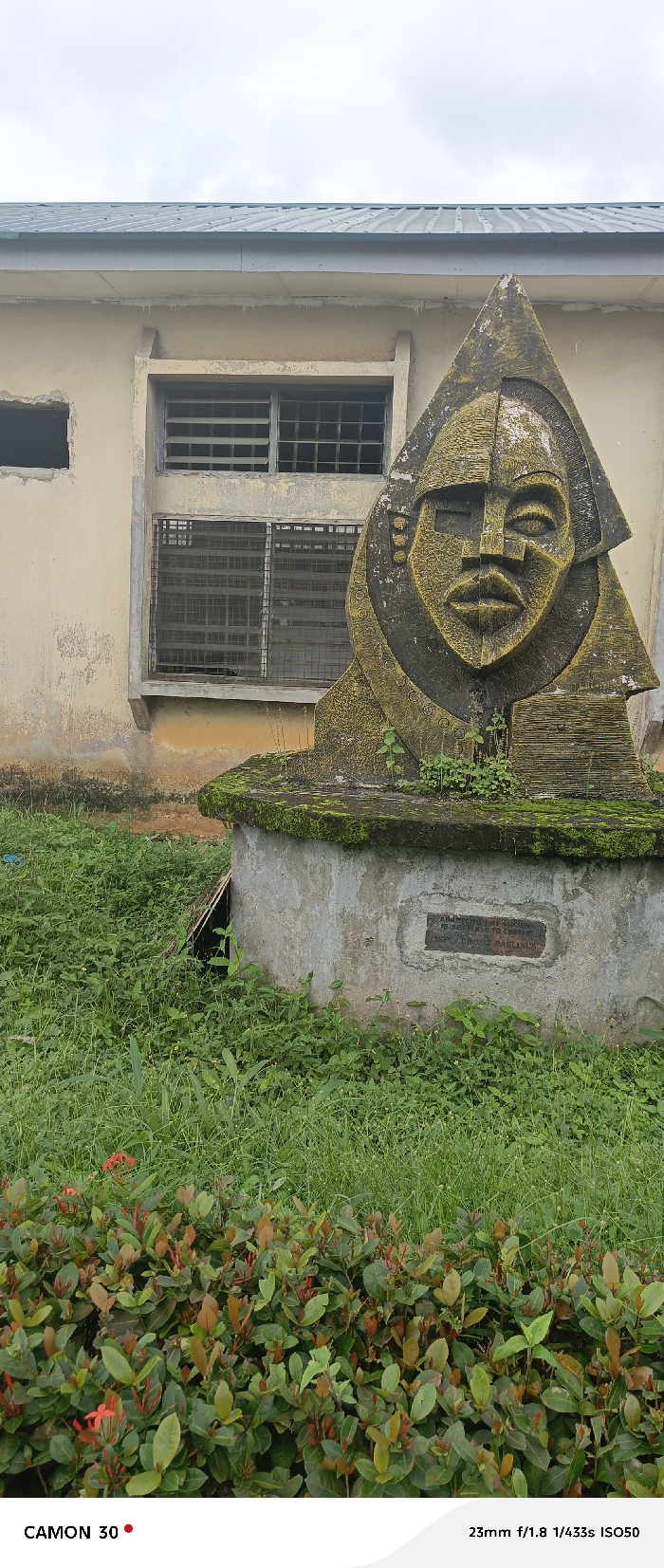 The image depicts an outdoor scene at the University of Uyo, Uyo, Nigeria, under an overcast sky. A large, weathered, pyramidal sculpture of an abstract human-like face, predominantly dark grey with significant yellow-green moss and lichen growth, is centered in the midground. It rests on a rectangular concrete pedestal, also covered in moss on its upper surface, which features an embedded metal plaque. The plaque's visible text reads: "A KNOWLEDGE OF SCULPTURE IS NO MASK TO CONCEAL" and below, "PROFESSOR PAULINUS". Behind the sculpture, a single-story building with light-colored, likely concrete or stucco, walls is visible. The building exhibits signs of wear, including discoloration and chipped surfaces. It features multiple windows: an open, dark rectangular void on the far left, and two larger windows to its right with multi-pane frames and metal security grates, some of which appear damaged or missing bars. A third, larger window below these also has a metal grate. The building is topped with a green corrugated metal roof and a light-colored fascia board. The ground around the sculpture and extending towards the building's base is covered in dense, unkempt green grass and various broadleaf weeds. In the immediate foreground, a manicured bed of dense shrubs with small, oval-shaped green and reddish-brown leaves is present, interspersed with clusters of small red flowers, consistent with Ixora plants. No individuals are depicted in the scene.