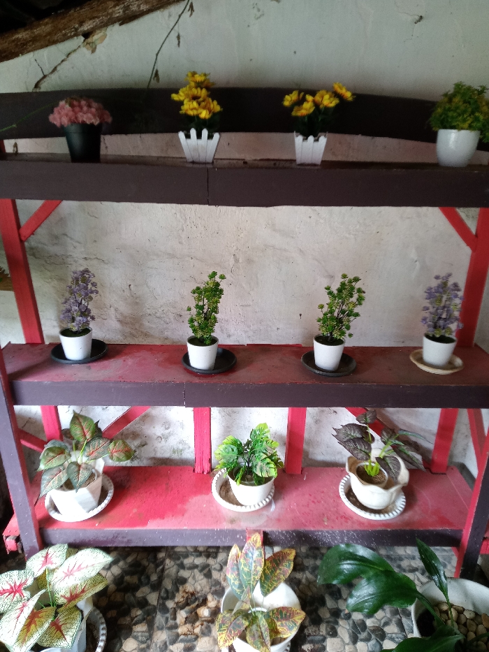 - "A three-tiered shelf painted in brown and red displays an assortment of potted plants" by FM-2nZTV2, licensed under CC BY 4.0