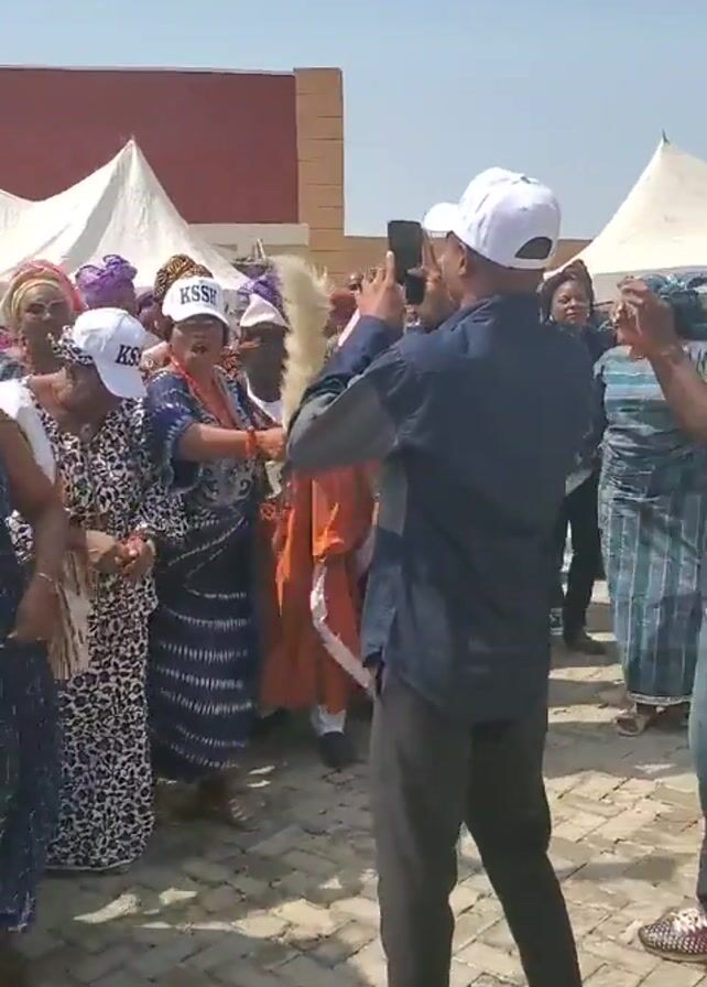 group of people dancing outdoors. They are dressed in traditional or colorful clothing, some wearing white baseball caps with the letters “KSSH” on them. A woman in the center is holding a white feather fan and dancing enthusiastically. Several men are filming the dancers with their cell phones. The event is taking place on a brick-paved area with white tents in the background. A building with a red-brick facade is also visible. The sky is clear and blue. The overall atmosphere seems festive and joyful.