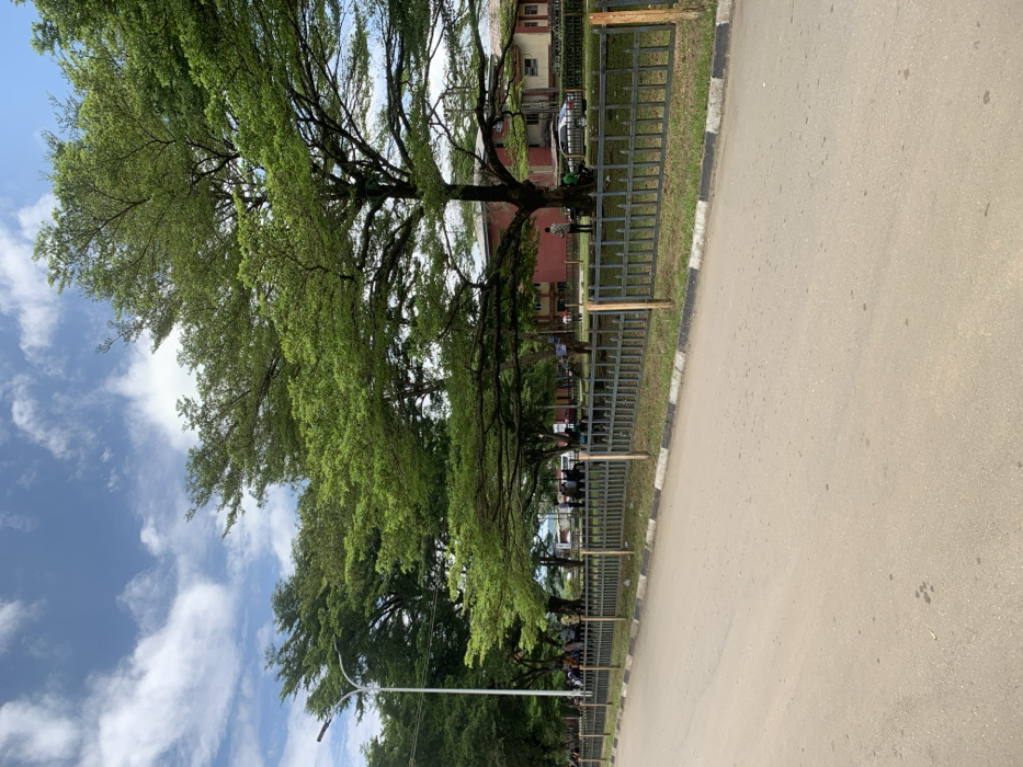 The image depicts a roadside scene within a city in Calabar, Nigeria, likely on a university campus or institutional grounds