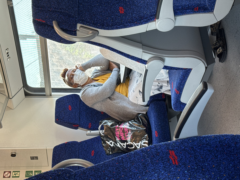 The image displays the interior of a modern passenger train carriage during daylight hours, consistent with Israel Railways' design, within the context of the Hevel Yavne Regional Council, Israel. A light-skinned individual is seated in a window seat on the right side of the frame, appearing to be asleep or resting. They wear a white medical face mask, a mustard yellow top, a light grey open cardigan, and a white patterned skirt. Their hair is covered by a light brown headwrap. Their head is tilted to the left, supported by their right hand which rests on a small, light grey foldable tray table. On the floor beneath them, two sandals are visible: a black double-buckle slide and a patterned slipper. To the left of the person, on the adjacent seat, a black plastic shopping bag with white text "SAYANA" and "PRETTY IMPORTANT STUFF" is placed. The train seats are upholstered in blue fabric with small red speckled patterns, framed by light grey and white plastic armrests and seat backs. Overhead luggage racks are partially visible. Through the window, bright sunlight illuminates a green and white striped structure or awning, suggesting the train is either stationary at a platform or passing industrial infrastructure. On the interior wall to the upper left, emergency exit signage and a circular call button are mounted. The train floor is light grey.