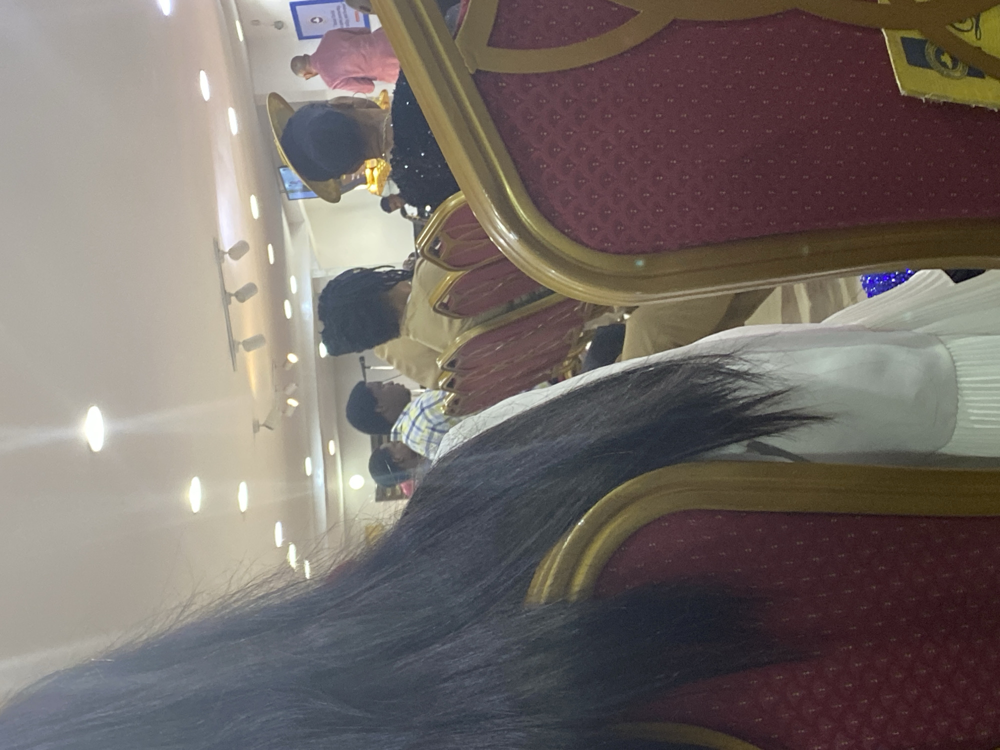 The image, likely taken in Lekki, Nigeria, depicts a group of people seated in an indoor space with bright, recessed lighting. The focus is on a person with long, dark hair sitting in a red chair with gold trim. Other individuals are visible in the background, some wearing traditional Nigerian attire, including a woman in a gold headwrap and a person in a pink outfit. The environment appears to be an event or gathering, as evidenced by the seating arrangement and the formal attire of the attendees.