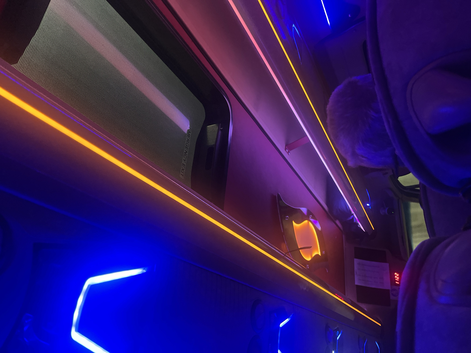 interior of a bus at night, illuminated with a combination of orange, pink, and blue neon-like lights
