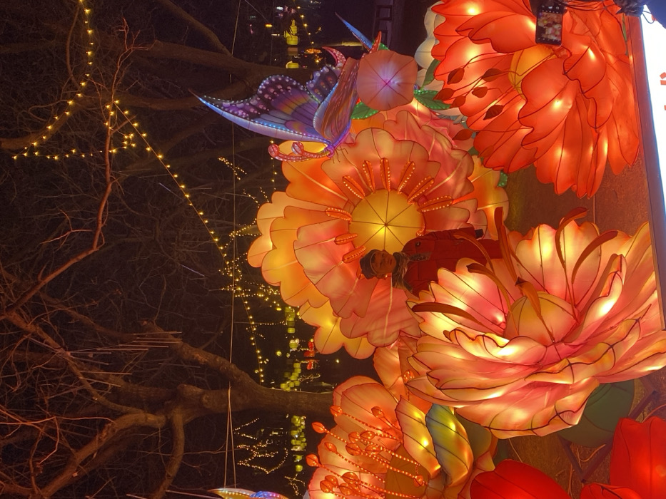The image depicts a nighttime outdoor scene in Jinzhou, China, likely within a park or public display area. A young child, dressed in a red jacket, dark beanie, and a scarf, stands centrally among a dense arrangement of large, illuminated lanterns. The lanterns are primarily shaped as flowers in varying stages of bloom, exhibiting radiant hues of orange, yellow, and red, with some subtle green elements. To the child's right, a prominent butterfly-shaped lantern with multi-colored wings (blue, purple, pink, yellow) is visible. The background features bare tree branches silhouetted against a dark sky, adorned with numerous strings of small, warm-toned lights that create a festive ambiance. A partial view of a hand holding a mobile phone is visible in the lower right quadrant, suggesting the scene is being documented. The ground beneath the lanterns is largely obscured by the decorations.