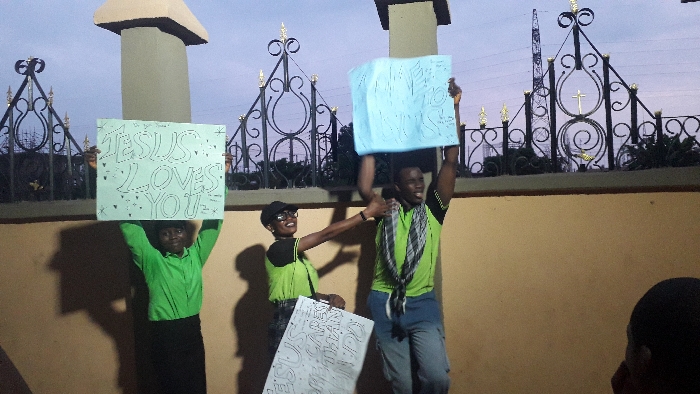 Three individuals are depicted outdoors during dusk in Onitsha, Nigeria, against a backdrop of an ornate black wrought-iron fence featuring a central golden cross and decorative gold finials. A tall metal lattice transmission tower is visible behind the fence to the right. This location is identifiable as the vicinity of the Holy Trinity Cathedral Basilica in Onitsha. From left to right: 1. An individual, appearing female, in a green long-sleeved shirt and dark lower garment, holds a white sign above her head with "JESUS LOVES YOU" written in green block letters. 2. An individual, appearing female, wearing a black cap, black short-sleeved top with green accents, and dark trousers, smiles broadly. Her right arm is extended forward and slightly to the right, index finger pointing. Her left hand holds a white sign with unreadable dark text, positioned lower. 3. A male individual in a black and green striped shirt and blue jeans, smiles broadly with an open mouth. He holds a light blue sign above his head with unreadable dark text. All three central figures are looking forward and are engaged in actively displaying their signs. A partial view of a fourth person's head is visible in the bottom right foreground. A low, light brown wall runs across the mid-ground, beneath the ornate fence.
