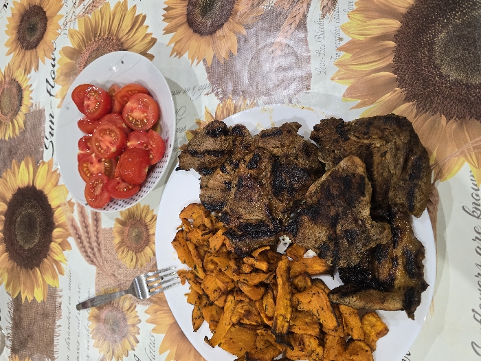 A prepared meal is observed on a table in the city of Byala Cherkva, Bulgaria. The scene features a white rectangular plate containing several irregular pieces of grilled dark brown meat with visible char marks, accompanied by a pile of irregularly shaped, orange-colored food items, consistent with roasted sweet potatoes or squash. A silver-colored metal fork rests on the tablecloth, to the upper left of the main plate. Adjacent to the main plate, a smaller white bowl holds numerous slices of red tomatoes. The items are arranged on a tablecloth patterned with large yellow and brown sunflowers, interspersed with what appears to be wheat stalks and segments of English text, including "Sun-Flow" and "Love-Lies-Bleeding". No individuals are visible in the image.