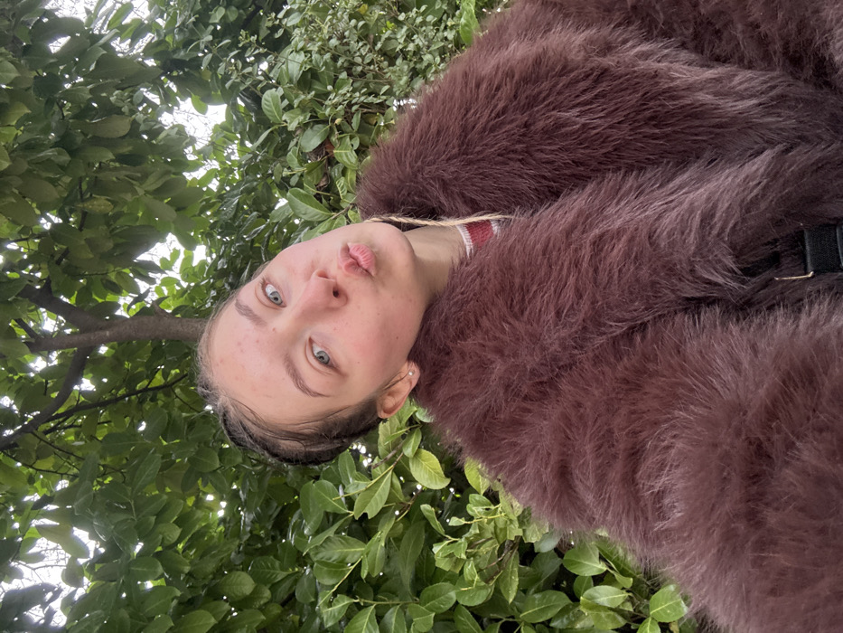 A young female subject is depicted in a close-up, upward-angled selfie, positioned outdoors against a background of dense green foliage. She has light skin, blue eyes, and visible blemishes on her forehead. Her dark hair is pulled back, with a lighter, possibly braided, strand visible on the right side of her face. She is wearing a small silver stud earring in her left earlobe. Her lips are pursed into a "kissing" or "duck face" expression, and her head is tilted slightly to the left. She is dressed in a voluminous, shaggy dark reddish-brown (maroon/plum) faux fur coat, with a red and white striped garment visible underneath its wide collar. A black strap, likely from a bag, is partially visible across her upper chest. The background consists of lush green leaves from trees and shrubs, with a tree trunk visible behind her left shoulder and glimpses of an overcast sky through the canopy. The specific location within Yambol, Bulgaria, is not discernible from the visual data provided. There are no other individuals visible, and no interactions are depicted.